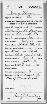 In this next document, Company Muster Roll, H. Flowers appeared as a Private in Company F of the 21st USCT. Joined for duty and enrolled: when August 17 1864, where Jacksonville, Fla, period 3 years. Mustered in: when Aug 17, 1864, where Hilton Head, SC. Present or absent Present Remarks: To be credited to State of Mass.