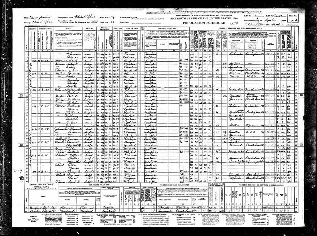 Henry and Nancy married in Florida when Nancy was 40 and Henry was 24 (her Tea-Cake). They had a son around 1915. In the 1930 Census, Nancy is 57 years old. Henry passed away in 1949. In the 1940 Census, I find him in the hospital listed as a patient. Where was Nancy? Well, I was too impatient to wait for the PA Census to be name indexed, so I decided to search for her myself. In 1941 article of Rachel Flowers, a reporter listed her address as 412 Salford Street. With this information, I searched the Census by street and found the next census. Take a look.