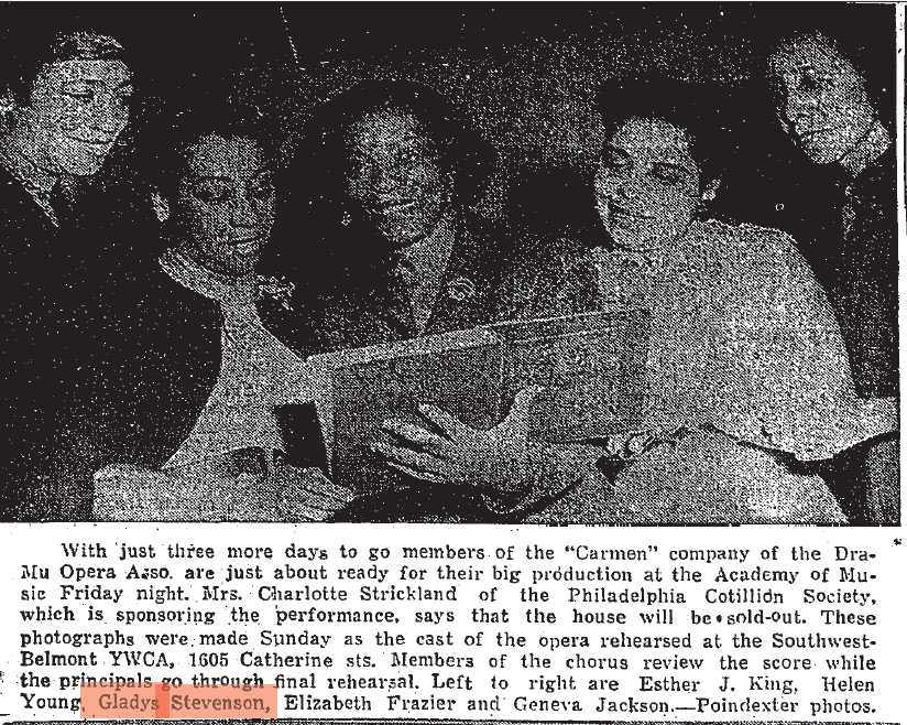 Like her sister, Gladys also appeared in the Philadelphia Tribune and the Afro-American. In December 1930, Gladyce hosted a dinner party where she wore “graceful frock of for-get-me-not blue lace.” In attendance was Mrs. George Conway (her “sister”), Mrs. James McCallian, Miss. Rachel Flowers (sister), William Ellis, Raymond Spearman, Paul Stevenson (future husband), Charles Queene, J. Walker Freeman, Herbert Wilson (future brother-in-law), Samuel Hardie, and Mr. Nichols.