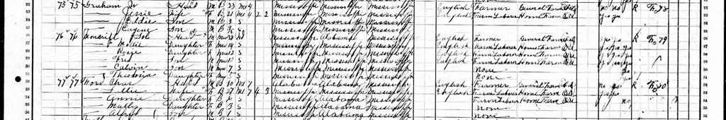Where did Eve Evers come from? In this census, she is listed as the eight year old daughter of Jim. This should not pose a problem, right? Wrong. The issue is she is older than Jessie’s children from her previous marriage. She only had two children from W. Graham not three, which means that Eve had to be born before Jim and Jesse even met. Jim may have had a child as the result of another marriage or … before entering the marriage as well.