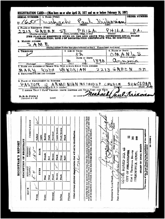 Meshach’s WWII registration draft was more legible. Thank you for whoever wrote in print and not cursive. By 1942, Meshach resided on 2213 Green Street Philadelphia, PA. He was 52 years old married to Mary Ruth Krikorian and pastor of the Armenian Methodist Church on 59th Cedar Street. His height was 5’4 inches and he weigh 155 pounds. He was listed as white with a sallow complexion (whatever that means), his eye color changed to brown, and his hair color was still black.