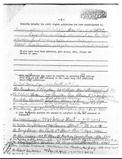 Describes briefly the civil rights activities you have participated in: Geraldine briefly describes her work with the Philadelphia SNCC chapter and the Chester situation (whatever that is). Also wrote about her time with the NAACP within the Labor Committee.