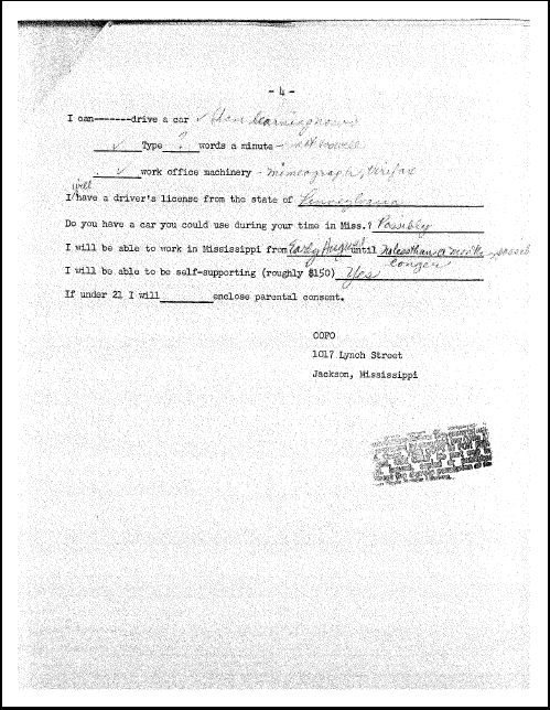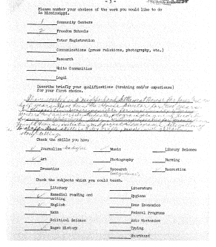 Given that most who participated in the Freedom/Summer Project were Northern, white, and of the middle class, I suspect Geraldine could have been a participant or a trainer for her family was closely involved and members of SNCC. When I first read her application, it was difficult to read her writing. It was legible, but it was difficult to understand how a person could reply to questions such as who to contact to bail you out of jail or who to notify about injuries? This only shows these volunteers of Freedom Summer bravery and willingness to do something.