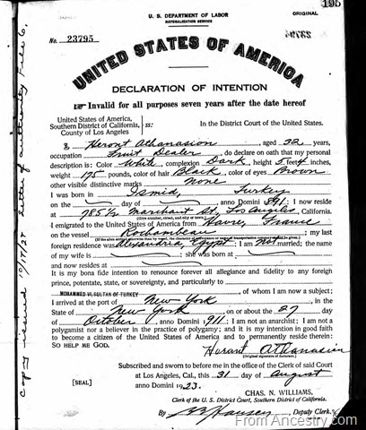 What you will note from these two documents is the misspelling of Hrant’s name. It is written Herant as it was spelt in the 1920 census. He was 29 years old and employed as a farm laborer. Also, this is important to note, like Meshach and Jacob, Herant claimed an exemption from war because of his religious beliefs. It seemed as if another draft form was filled out in 1918. The last document I will leave you with is Herant’s Declaration of Intention (naturalization) in 1923.