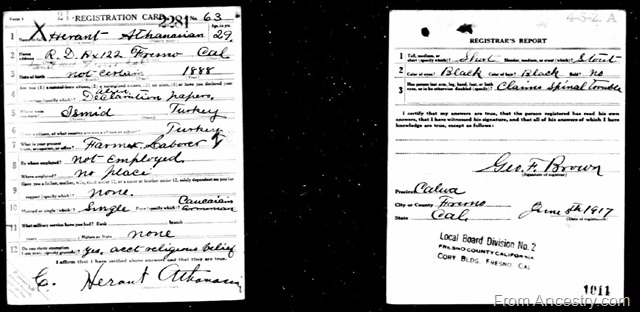 Here, Herant lived with two other Armenians and worked as a farm laborer. By 1920, he was 30 years of age. Again, this information was reaffirmed through another federal document—Herant’s WWI draft card. His age varied from document to document and Herant himself was even uncertain of his birth date. As you can see in this document and the next, he writes uncertain in those spaces.