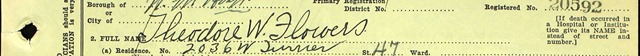 The first death certificate I found was Harry Florence Flowers’. Outside of the medical coroner, the remainder of this record was filled out by his daughter, Rachel Flowers. Here, I am finally given Harry’s actual birth date, February 23, 1845. He was 83 years old at the time of his death. His last occupation was listed as a carpenter and his father’s name was Harry Flowers; however, I believe this was a simple guess from Rachel. Sadly, there was no last address given. The search for the Flowers’ home continues.