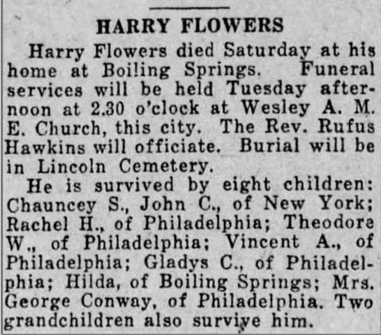 Recently, the Pennsylvania Historical and Museum Commission digitized the state’s death certificates from 1906 to 1944 onto Ancestry.com. At first, I was unsure of what to make of this. It is strange, in my opinion, for private records to be made public. I can recall the day I came across Hilda’s, Rachel’s sister, death certificate. It was interesting, yes, but it is something I would never upload to my blog. As a researcher, I must remember that this is someone’s aunt/uncle, wife/husband, or mother/father. This is not my family and I must respect how the Flowers would feel. With that being said, I will only post a portion of the death certificate (only the individuals’ names) to use as an introduction to each person. If you have an Ancestry subscription, you are free to search for these records, but as I stated before, you will not receive full access to these records from this post.