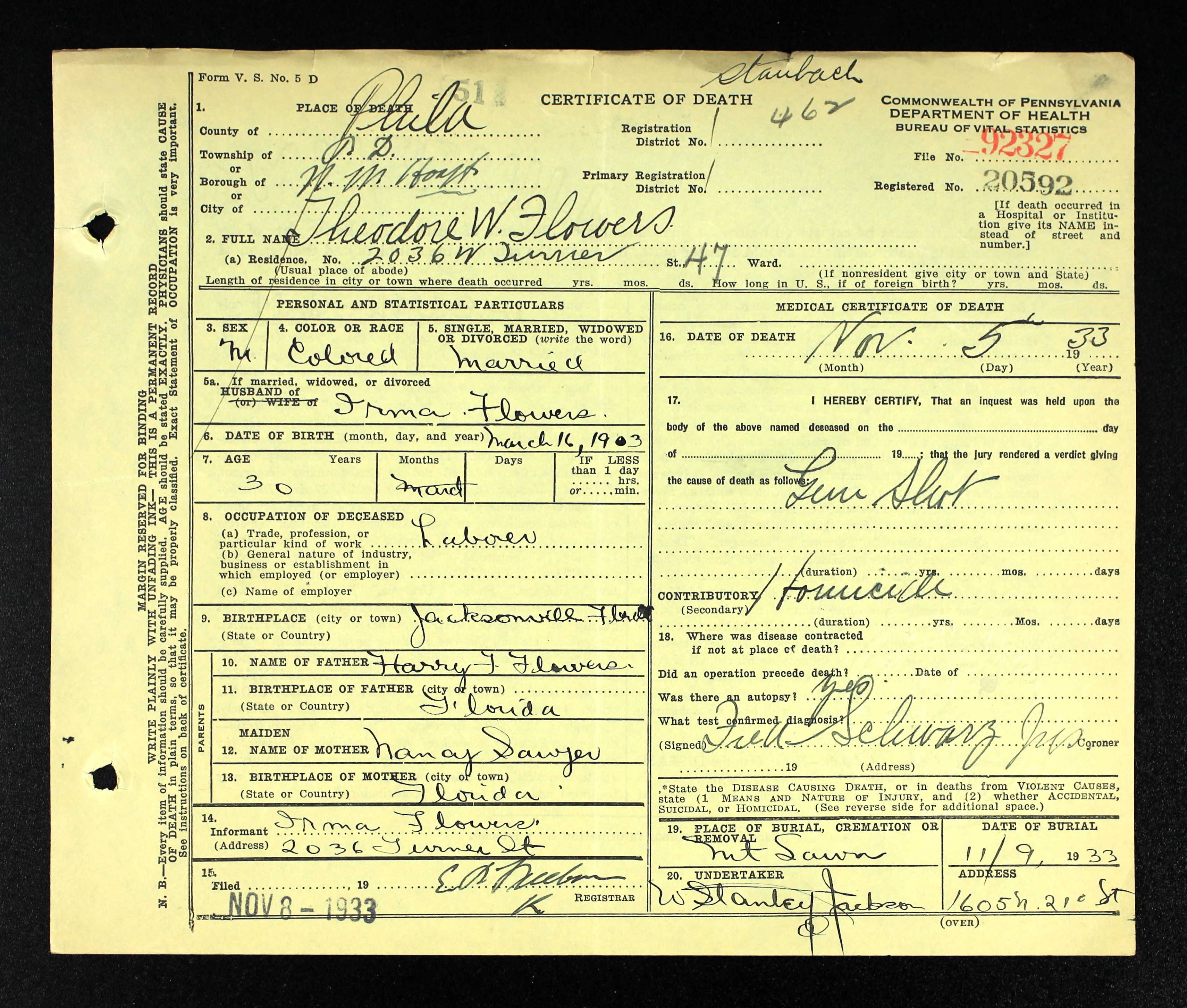 Now, this post will focus again on Theodore Flowers. His death certificate left me with a great amount of questions: Why was he murdered? By who? What exactly were the events that led up to his homicide on November 5, 1933 in Philadelphia, Pennsylvania?