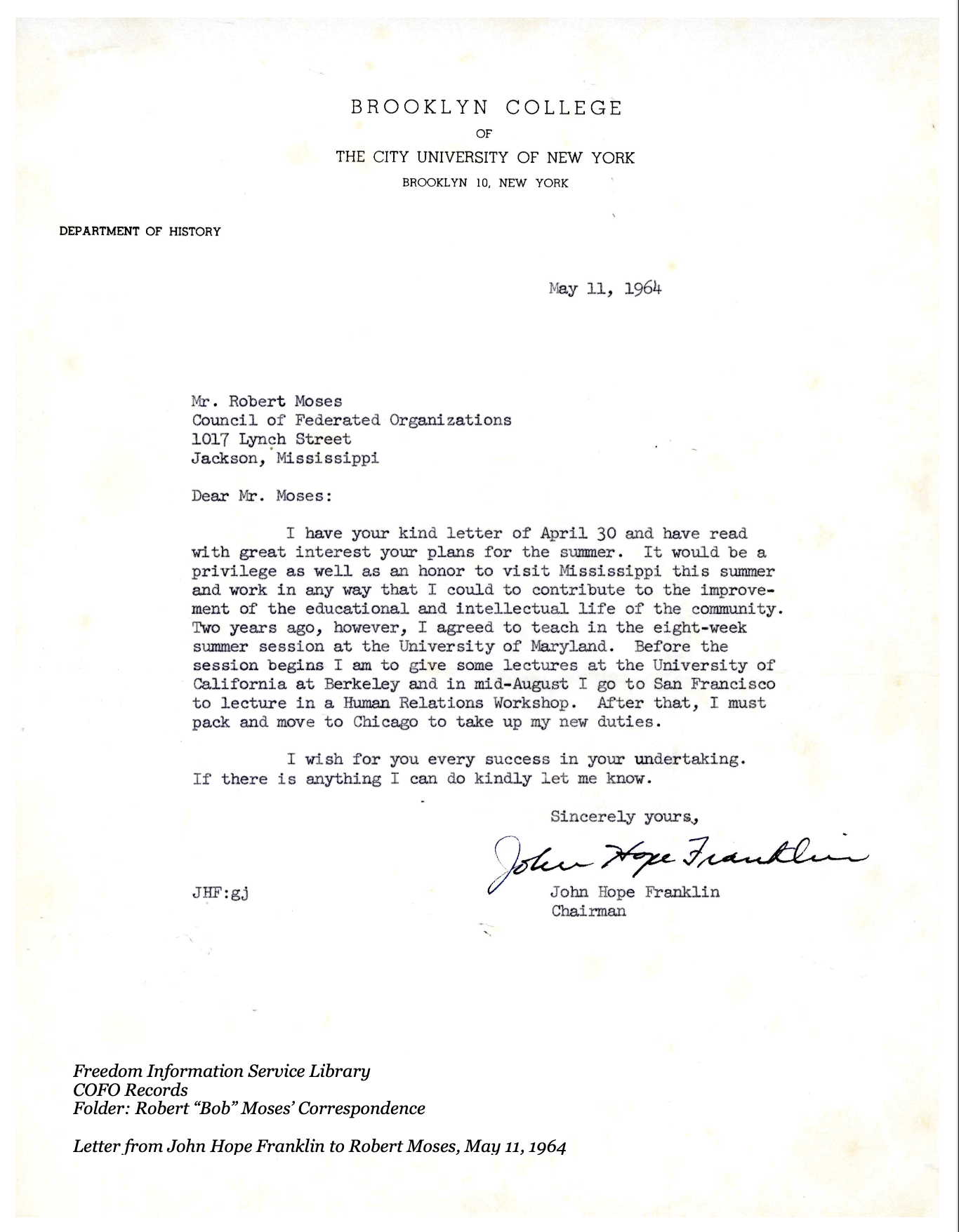 When I came across the letter below, my jaw dropped, which happens a lot in the FIS Library. It was a letter from John Hope Franklin in response to Moses’ request, or rather invitation for the historian to visit Mississippi that long, hot summer of 1964. Unfortunately, Franklin had prior commitments that summer of 1964 and was unable to come down South. He concluded, “I wish for you every success in your undertaking.” And I wondered as I held this letter, what if Dr. John Hope Franklin came to Mississippi that summer.