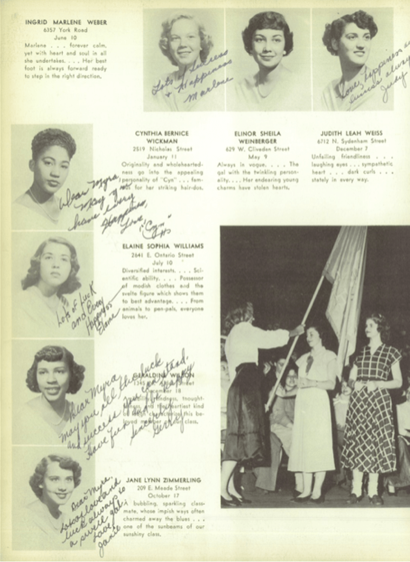 In the fall of 1949, seventeen-year-old Geraldine Louise Wilson posed for her senior photograph as a midwinter graduate at Philadelphia High School for Girls, known to her as Girls’ High (see figure below). After four years of study at this prestigious institution, this portrait represented a rite of passage for all soon-to-be graduates of class number 178. Decades later, in 1982, a fifty-one-year-old Wilson reflected on this accomplishment through poetry. In the opening excerpt of ‘High School Portrait’, she recalled someone adorning her with the classic light-coloured velvet drape and a string of pearls. Perhaps a slight readjustment, as Wilson was careful not to ruin her curls. She remembered waiting for the photographer to pose her – gaze to the right, gaze to the left and now look into the camera – an almost smile for a proud family. Such language provides a gateway into Wilson’s schoolgirl years within Philadelphia’s public schools during the 1930s and 1940s.